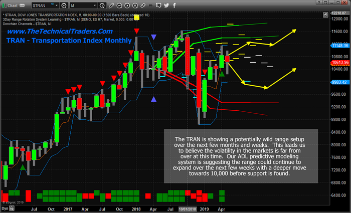 This next chart is a Weekly TRAN chart showing our Adaptive Fibonacci price modeling system.  The Fibonacci price modeling system is one of our standard analysis tools.  This utility is suggesting that price weakness may set up a Descending Flag formation over the next few weeks/months.  This type of pattern suggests that a breakout move will result after the apex is reached.  The YELLOW trend line on this chart may become a downside price target if our ADL predictions are correct and the TRAN price breaks down toward the 9,600 level or lower.
