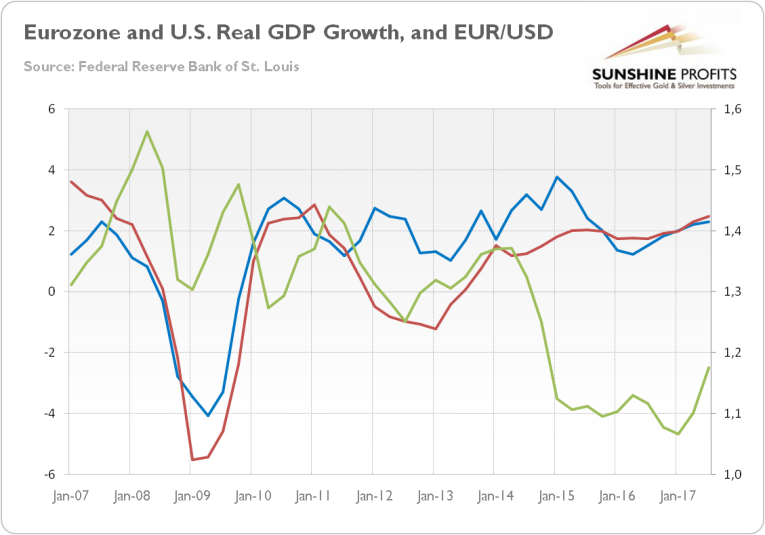 Chart 1: The real GDP growth for the Eurozone (red line, left axis), the real GDP growth for the U.S. (blue line, left axis), and the EUR/USD exchange rate (green line, right axis) from 2007 to Q3 2017 (percent change from the year ago).
