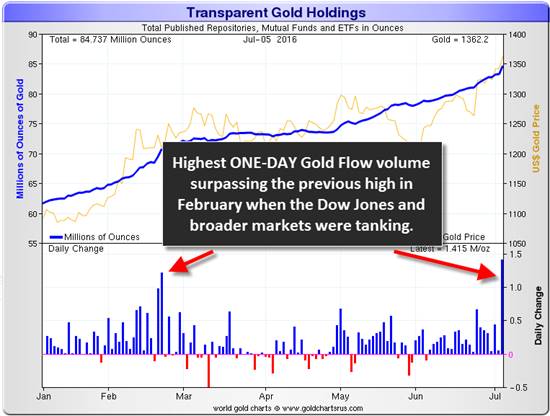 The one-day previous record set back in February was approximately 1.25 Moz. However, the 1.4 Moz of gold that flowed into Gold ETF’s & Funds on July 5th was the result of the surging gold price, not the falling stock markets. What happens when the markets crack as the gold price spikes higher?? We could see double or triple that amount in just one day.