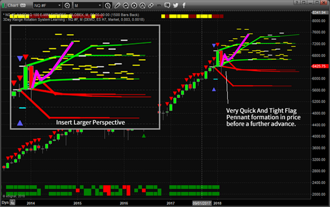 This image of the Monthly ADL system is showing, very clearly, that prices will likely rotate within the current price range while establishing a technical pattern for further advancement. We believe our analysis from late December 2017 is still very valid and accurate. We believe this new FLAG formation is a result of the price correction we expected from our earlier analysis, yet we could not predict the severity of the move at that time. We did know that NQ prices had already exceeded our predicted boundaries and because of that we felt that prices were going to contract in a moderately aggressive manner – we even warned our members of this potential.