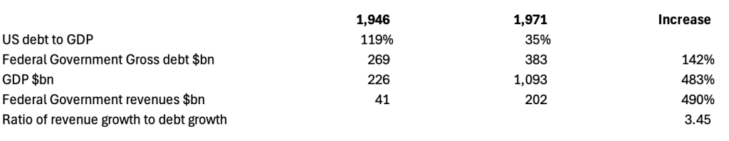 Much of the complacency over government debt levels arises from the fact that high WW2 debt levels were reduced over the following two decades to manageable levels, fuelling a belief that it can be done again. America’s government debt to GDP in 1946 peaked at 120%, below current peace-time levels, falling to 35% in 1971 when Nixon suspended the Bretton Woods Agreement. The relevant figures are shown in the table below.
