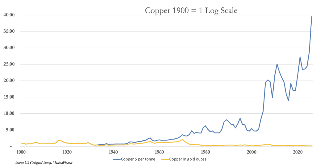 A cleaner price comparison is found in commodity prices. Oil was pegged at $2.57 per barrel, increasing to $3.56, which held until 1973: that’s a 38% increase compared with a near doubling of US consumer prices. Copper was similarly more stable priced in gold, as the next chart demonstrates.