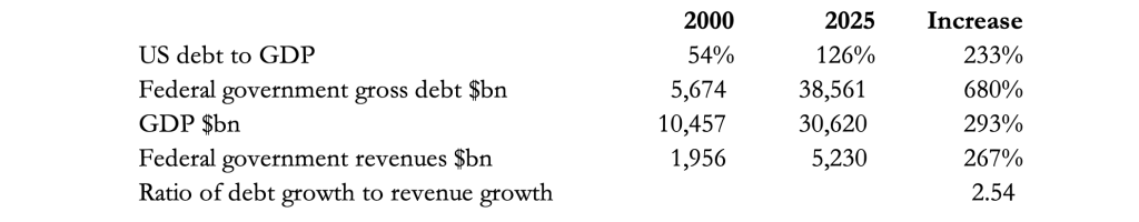 Various papers have been written on this problem, all concluding that a debt trap occurs when the rate of GDP growth falls to below the rate at which the cost of funding the debt increases. But it is surely more correct to compare the rate of increase of tax revenues with the rate of increase of the debt: do tax revenues increase more rapidly than the debt, or does the compounding debt increase more rapidly than revenues?