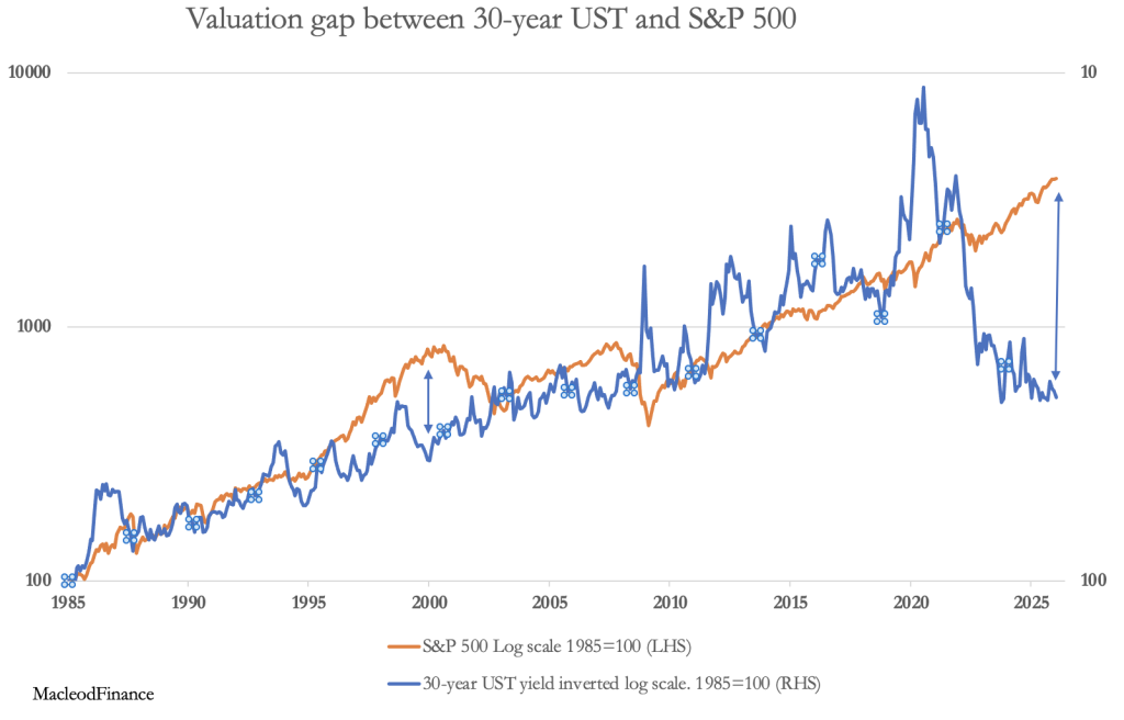 It is worth taking time to study this chart closely. Not only is the excessive value of the S&P over the long bond greater than it has ever been, but it shows signs of going higher due to rising bond yields. This will only be resolved by an equity crash to rival or even exceed anything seen in history.