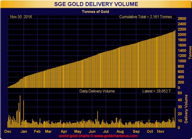 http://www.zerohedge.com/news/2016-12-02/buy-dip-us-gold-coin-sales-soar-highest-16-months-china-premium-spikes-3-year-highs discusses gold demand. The below chart shows offtake from the Shanghai exchange.