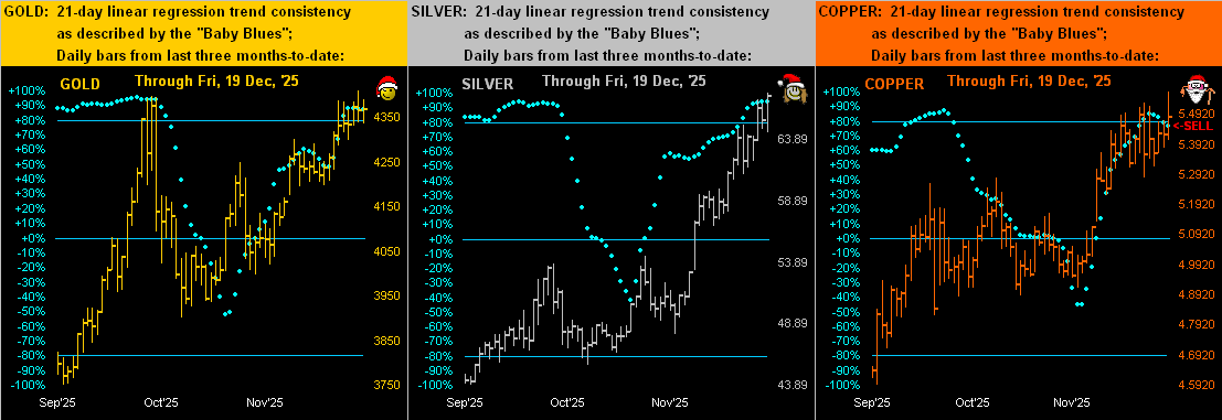For as we next turn to the metals’ Market Trends for the last three-months to date featuring Gold on the left and Silver at center, we’ve also included Copper on the right.  As you well know, Cousin Copper does influence Sister Silver such that she’ll on occasion shed her precious metal pinstripes for her industrial metal jacket.  And by Copper’s baby blue dots of regression trend consistency, note the word “SELL” pointing at the rightmost “Baby Blue” having just slipped below its key +80% axis.  How has such Copper “SELL” previously affected Silver?  From a year ago-to-date there’ve been four like Copper “SELL” signals, then finding Silver within the ensuing 21 trading days (one month) respectively dropping by as much as:  -21.3%, -5.5%, -0.4% (“whew”), and -14.8%.  Just something of which to be aware.  Here’s the graphic, (minding, too, the “Baby Blues” of the precious two):