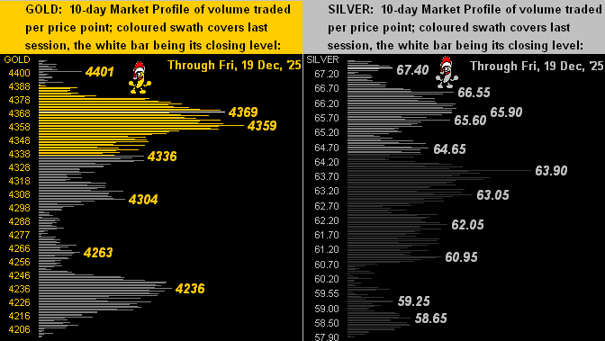 Next to our 10-day Market Profiles for Gold (below left) and for Silver (below right).  With such an array of underlying support levels, ’tis truly a Santa Bananarama, which is “Really Saying Something … bop-bop shoobie do-wah” –[’82]: