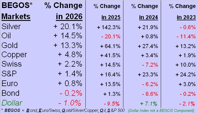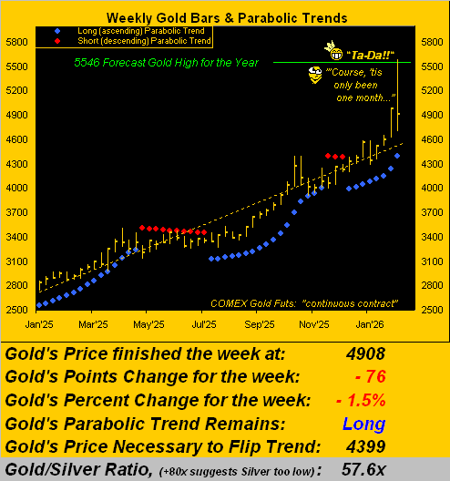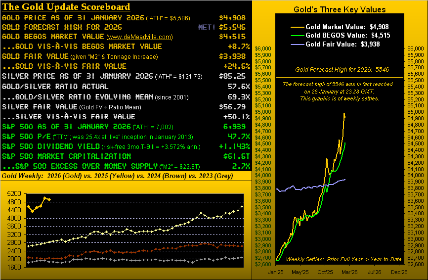 Through the balance of the week’s past two trading days, Gold went on to decline by as much -15.9% to Friday’s low of 4700, toward settling the week yesterday at 4908.  And “premature” to be sure is acknowledging the year’s high so far of 5586 as being “it” with 11 months still in 2026’s balance.  But Gold — at least for the present — is unwinding back to reality, even as it remains fundamentally overvalued.  For per the above opening Gold Scoreboard, price today at 4908 is +8.7% above its BEGOS Market Value (4515 via the intra-relative movements of the Bond, Euro, Gold, Oil and S&P 500), let alone +24.6% above its Fair Value (3938 via Dollar debasement as countered by Gold’s own supply increase).