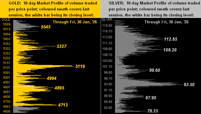 From the broad-term past to the near-term now we’ve the 10-day Market Profiles for Gold on the left and Silver on the right.  And the pre-fallout low-to-high tracings are remarkable, respectively at +23% for Gold and for Silver a stunning +62% just in ten trading days!  In both panels we’ve selectively labeled prominent volume-dominant price levels.  And the barely visible wee white line for each market is Friday’s settle: