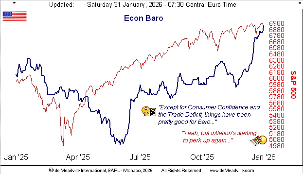 Meanwhile through the midst of it all, the S&P 500 — despite marginally flirting above a record 7000 for 26 minutes on Wednesday — hasn’t really moved about to any material extent.  Again by the deMeadville Market Ranges page, of the eight BEGOS markets, the S&P and the Bond are the most subdued of the bunch.  As expected, the Federal Open Market Committee voted (albeit not unanimously) to maintain the interest rate on FedFunds in the 3.50%-3.75% target range.  Too, Q4 Earnings Season (with about one-third of S&P constituents having reported) is running at an above average year-over-year improvement pace.  And the Economic Barometer is continuing to climb upward.  Thus, geo-politics and a FedChair pick aside, there’s not really that much goin’ on out there.  And specific to the Econ Baro, of the past week’s 11 incoming metrics, just two were worse period-over-period.  Here’s the one-year view: