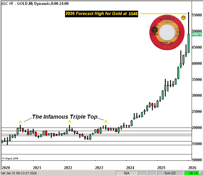 Next to Gold’s weekly bars we go, from one year ago-to-date.  And notwithstanding yesterday’s record intra-day plunge (-14.2%), Gold now at 4908 still is +509 points above the parabolic “flip-to-Short” level of 4399.  ‘Course, range has rapidly expanded:  by the website, Gold’s EDTR (“expected daily trading range”) is now 218 points, although given Friday’s vast selling, we may see such range begin to narrow as folks (at least those who are still around), pull back a bit from the trading activity: