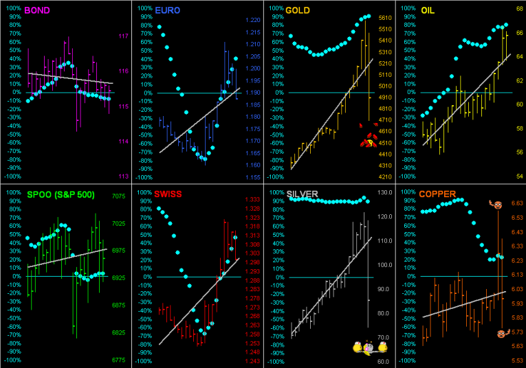 For the BEGOS Markets as a whole across the past 21 trading days (one month), here we go ’round the horn for all eight components with their diagonal grey regression trendlines and baby blue dots depicting the day-to-day consistency of each trend.  And not to be left out of the tumbling Metals Triumvirate, along with the yellow and white metals, so did the red see its price shred, Copper therein high-to-low losing -13.7% of its value.  Metals’ mania mayhem, indeed!