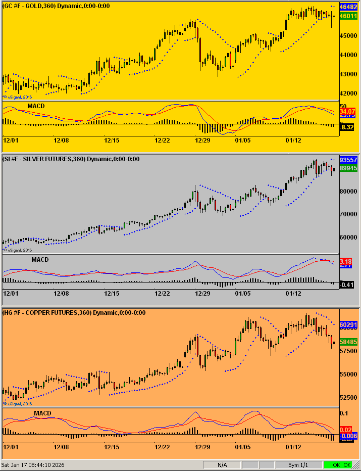 Arriving next we’ve this three-panel chart of such six-hour technicals for each of Gold, Silver and Copper.  The time frame is from the start of December-to-date.  This most recent week is from the x-axis label “01/12” (January 12th).  In all three cases: