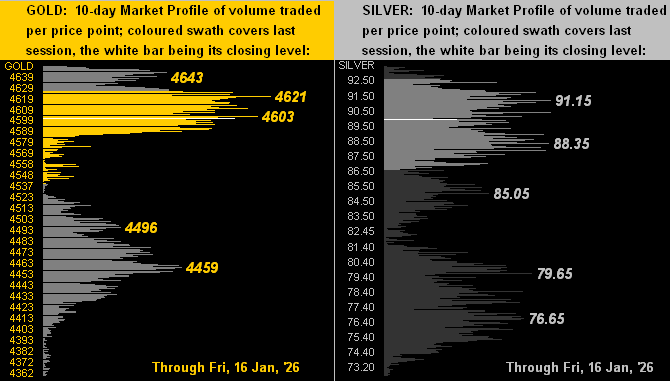 As well in a two-panel shell are the 10-day Market Profiles for Gold (at left) and for Silver (at right).  Because for both metals the respective trading ranges have been so vast these past two weeks, we’ve limited the number of labeled volume-dominant prices.  And for the present, Gold and Silver are deeply mired in high-volume zones:
