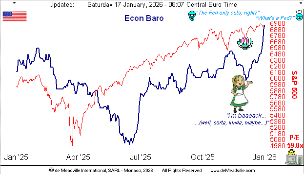 Year-to-date, 37 data items (including some in “shutdown” arrears) have come into the Baro, of which only 12 were worse period-over-period.  Hence the rise by this economic guise.  Recall the ’90s gridlock-is-good “Goldilocks Economy” of President Clinton(D) astride that Congress(R)?  Today’s politics aside, are we witnessing the return of Ms. Locks?  Again, inflation has been reported as slowing, but jobs numbers need to come up a bit.  Still, so far in 2026, the Econ Baro’s standout improved reports (much from Q4 2025 data) chronologically include Productivity, the Trade Deficit, the Unemployment Rate, Building Permits, the Current Account, Existing Home Sales, Initial Jobless Claims, both the Philly Fed and N.Y. Empire State Indices, and Capacity Utilization.  Too, from the “Whew! Dept.”, the potential end-of-January “shutdown” shan’t come to pass … just in case you’re scoring at home.