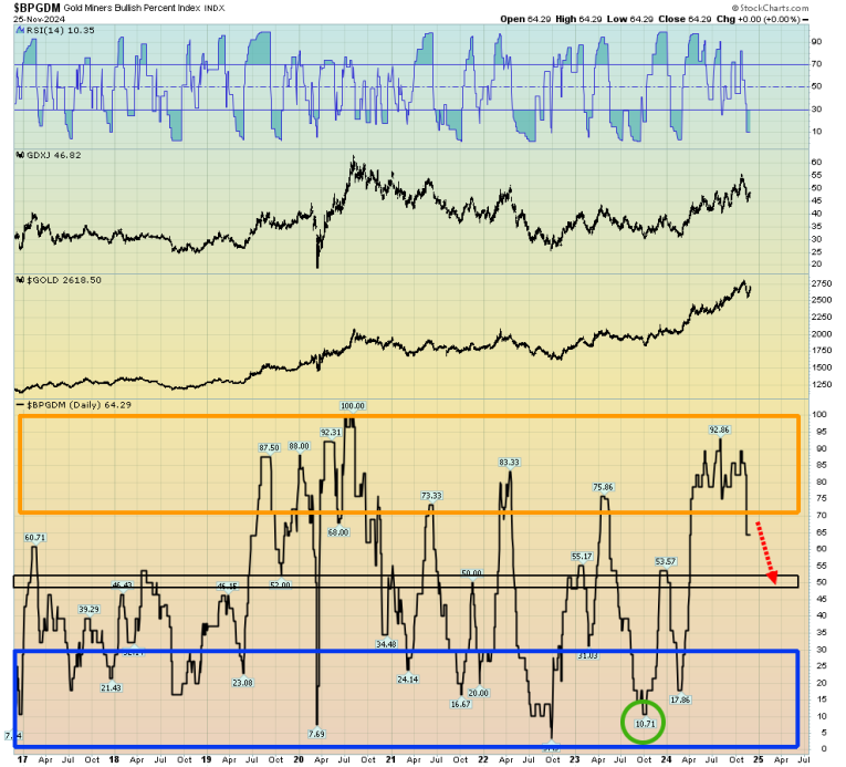 This is the BPGDM sentiment index chart. Key buy zones for the miners tend to feature sentiment indexes like the BPGDM moving down to at least the “midships” 50 area, but I prefer to see them in the sub30 area before I suggest investors buy with size.