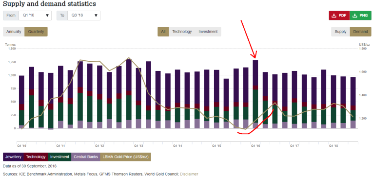 Take a look at the increase in Investment demand in 2010 through 2012 in relation to today. Also, pay attention to the huge Investment increase in demand in Q1 of 2016 and the correlative price advance that occurred as demand shot higher. One key factor for price advance is that Investment demand increases dramatically as a driving force for price increases. Because of this, we would watch for investment demand to increase dramatically over the next 4~6+ months which would indicate that a continued price advancement is expected.