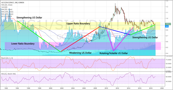 This first chart highlighting our custom Gold/Silver/US Dollar ratio (the blue area chart) in comparison to the historical price of Gold is actually very interesting. First, we highlighted the general trend direction of the US Dollar – showing Strengthening, Weakening and Rotating trends. Next, we highlighted the Upper and Lower boundaries of our custom price ratio to highlight key areas where the ratio changed direction or where prices initiated new or reversed price trends. It is fairly easy to see the price of Gold either initiated new trends or changed price trend at or near these Upper and Lower boundary levels. It is also fairly easy to see the huge price advancement between 2004 and 2011 occurred within a Weak and Rotating US Dollar environment. Additionally, within this same time span, we were able to witness multiple boundary rotations and different Gold price activity types as the US Dollar shifted from a downward price trend to a very volatile/rotating price trend (2009~2015).