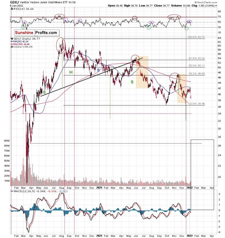 Moreover, with the GDX ETF’s weakness accelerating on Jan. 5/6, the senior miners have declined sharply in recent days. In addition, the current price action mirrors the senior miners’ ominous performance in July/August 2021 – just like I’ve been describing it for a few weeks now. As a result, the previous corrective upswing is likely over, and the GDX ETF should confront lower lows sooner rather than later.