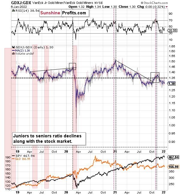 On top of that, the behavior of the GDXJ ETF’s RSI is also similar – with the indicator moving from roughly 30 to 50. For context, I highlighted the similarities with green and purple ellipses below. Also noteworthy, similar developments occurred in February/March 2020, before the profound plunge unfolded. As a result, the GDXJ ETF looks set for another sharp drawdown over the medium term.