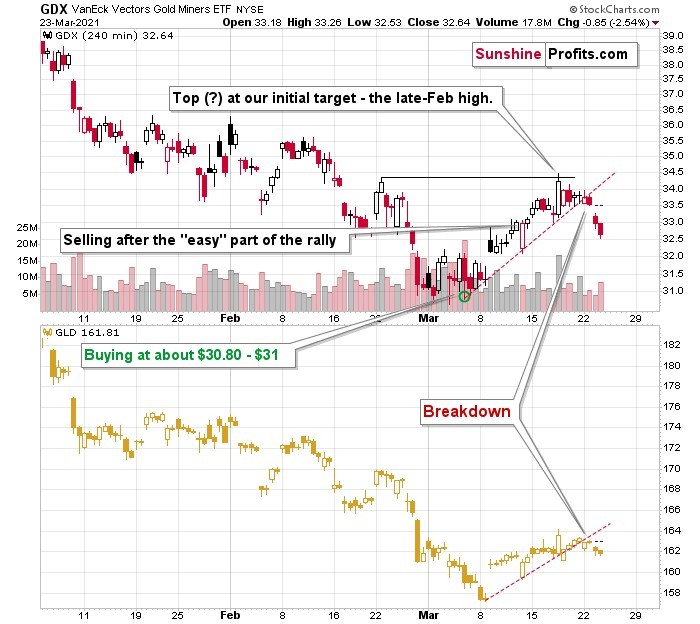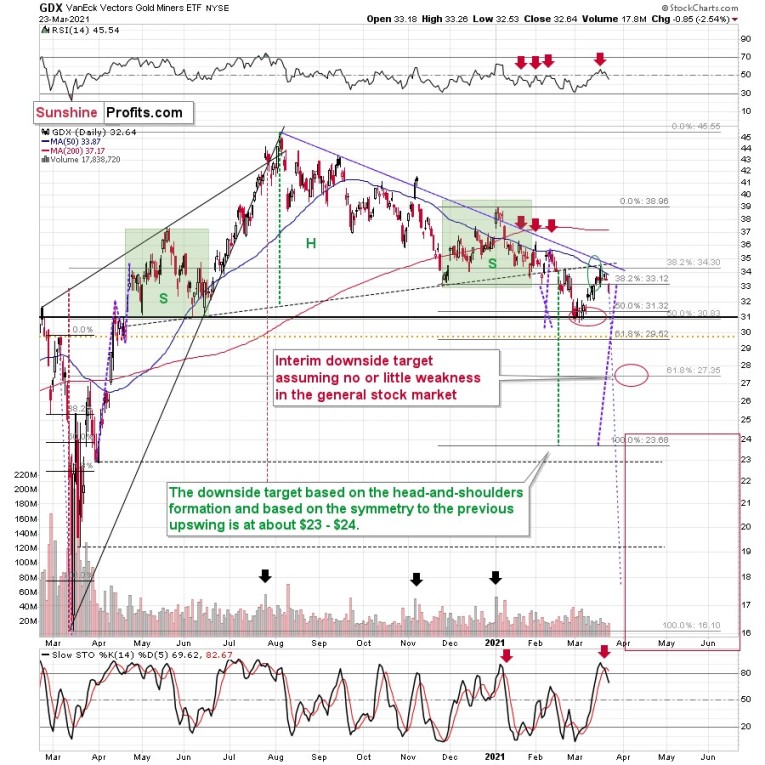 After the tiny breakdown that I described yesterday (Mar. 24), the GDX ETF declined significantly, and it even opened the session with a price gap. If you look at the left side of the chart, you’ll see that this is the way in which the big January decline started. In the next 2 months, the value of the GDX ETF declined by over $8.