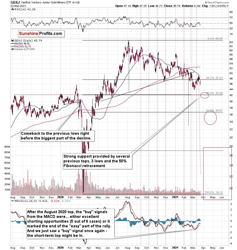 Having said that, let’s take a look at even bigger decline in the GDXJ ETF – proxy for junior mining stocks.