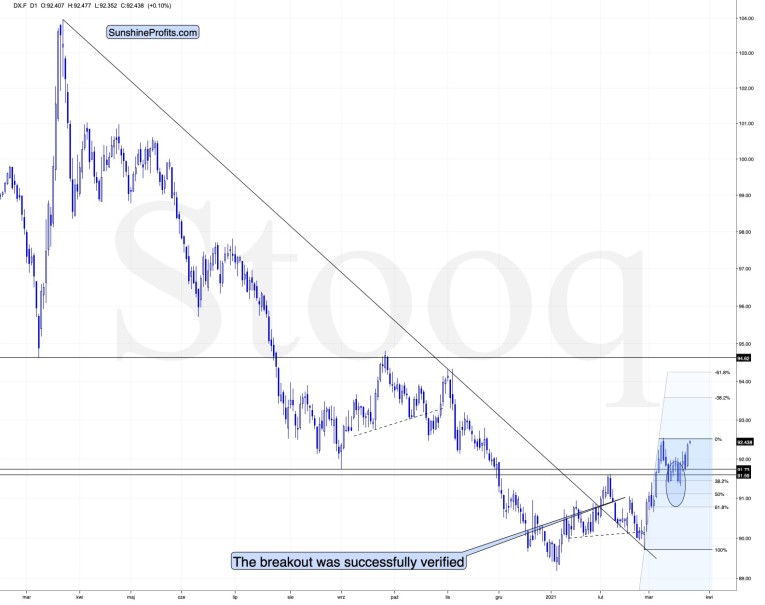 Right now, traders are likely taking the wait-and-see approach with regard to the USD Index. The latter just moved to its previous yearly highs. It’s already after verification of the breakout above the February highs, so it seems that it’s ready to break higher any day – or hour – now. When that happens, I expect the rally to take the USDX to at least 94, perhaps to 94.5 or 95. The September 2020 high is 94.8, so this level is the most likely upside target for the short term. I don’t think that the rally in the USD Index would end once it reaches the proximity of 95, but that’s when we might see another breather (perhaps after a breakout above this level and perhaps before the breakout, it’s too early to tell at this time).