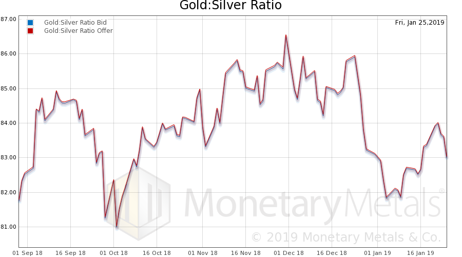 Next, this is a graph of the gold price measured in silver, otherwise known as the gold to silver ratio (see here for an explanation of bid and offer prices for the ratio). It fell almost a point this week.