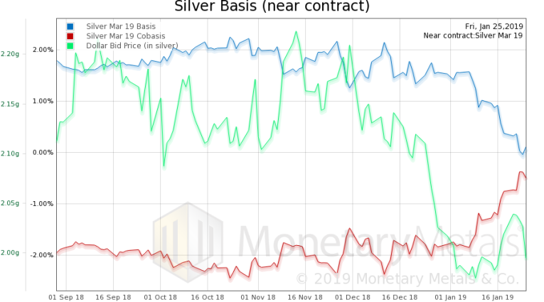 Here is the gold graph showing gold basis, cobasis and the price of the dollar in terms of gold price.