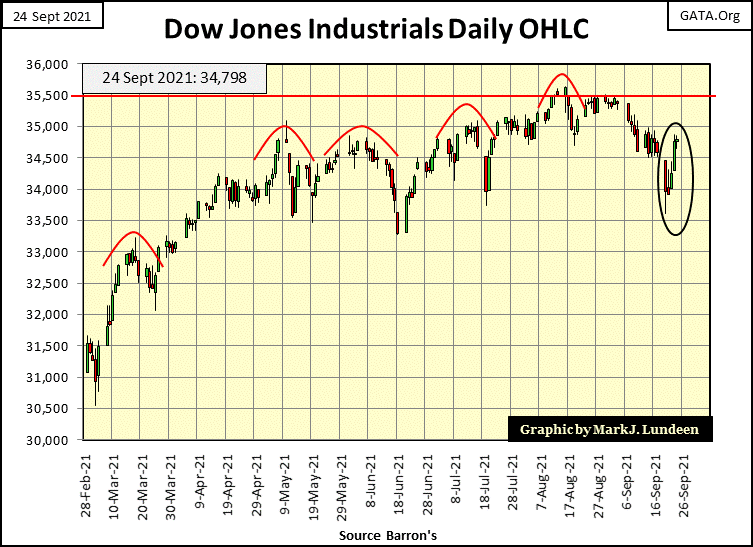 The Dow Jones and its step sum plot below shows the recent decline to its BEV -5% line. But its mid-week recovery is a bit hidden in it. What I see below is an eighteen-month market advance in need of a double-digit percentage correction. Whether or not the Dow Jones gets its correction is up to the idiots at the FOMC contriving “monetary policy.” In September 2021, I’m not holding my breath. But come October who knows? Until then, I’m waiting for another new all-time high for the Dow Jones.