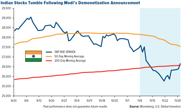 Inevitably, low-income and rural households have been hardest hit by Modi’s currency reform. Barter economies have reportedly sprung up in many towns and villages. Banks have limited the amount that can be withdrawn. Scores of weddings have been called off. Indian stocks plunged below their 200-day moving average.