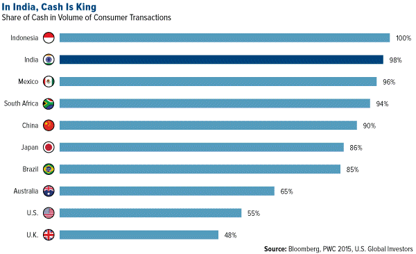 Last year, our office was visited by the founders of MoneyOnMobile, which provides full point-of-sale services to Indians who don’t have ready access to ATMs. Think of it as the Indian version of Square. It’s likely that with demonetization wiping out so much paper currency, demand for services such as MoneyOnMobile’s will skyrocket.