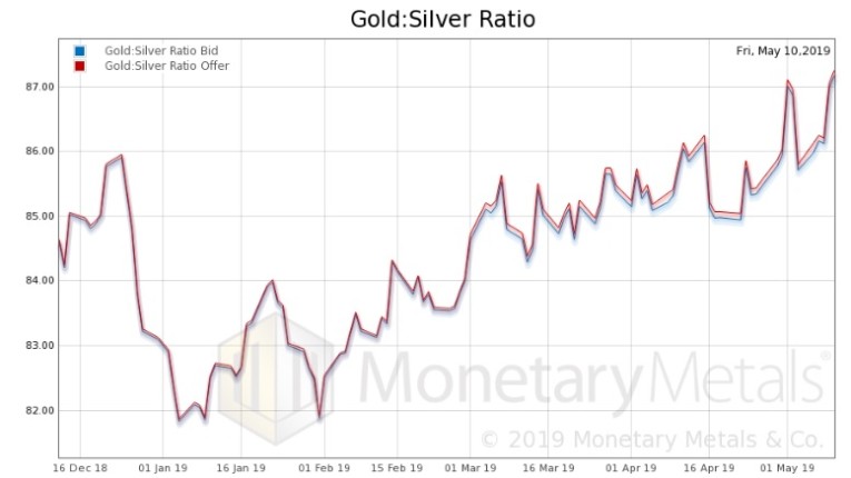 Next, this is a graph of the gold price measured in silver, otherwise known as the gold to silver ratio (see here for an explanation of bid and offer prices for the ratio). The ratio rose, to a new high over 87.