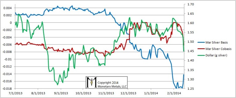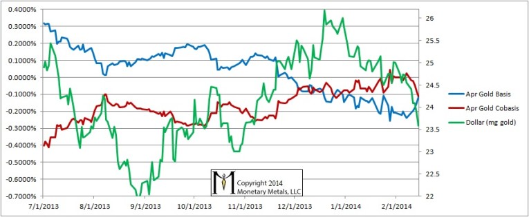 The April contract had been in a slight backwardation. Not any more. As the dollar has dropped, the cobasis has dropped a bit. Now it’s -0.11%.