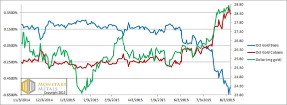 Right now, the October and December gold contracts are backwardated. These backwardations, like all of them in the past 7 years, are small. At the moment, they’re less than a dollar an ounce. This is not something you can see by using typical end-of-day quotes. You need a sensitive and precise instrument, which is what Monetary metals has built.