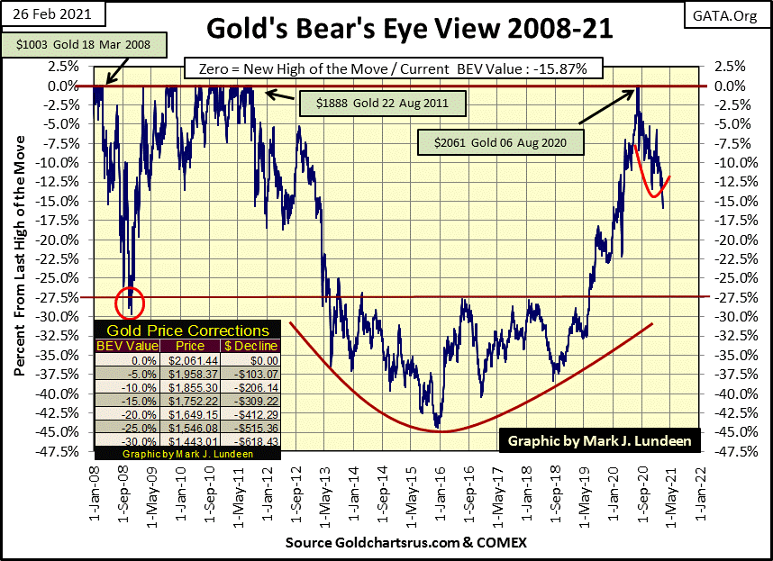 So, when one looks at the chart above, one has to wonder why gold, silver and the precious metal miners are doing so poorly? That’s an easy question to answer; the bears are the big Wall Street banks, and Washington allows them to cheat. Neither Wall Street nor Washington wants gold to rise up to its fair market valuation, a price far above last August’s $2,061. Not after all the inflation they’ve “injected” into the economy since August 1971. But I can’t plot fair market values on a chart, so let’s look at COMEX gold in its BEV chart below.