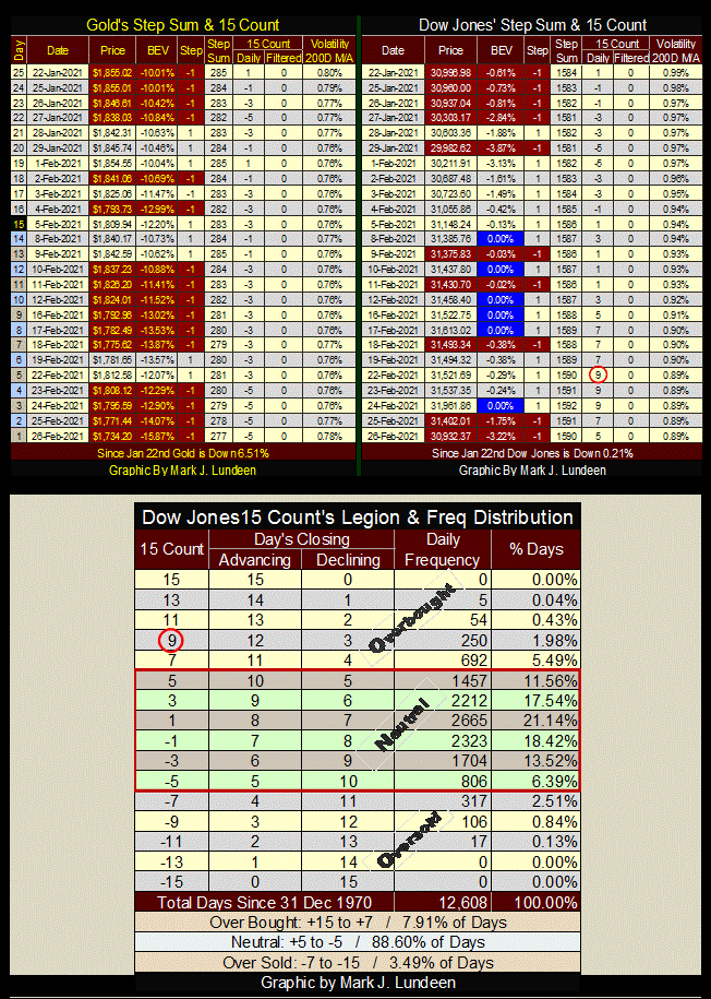 But this week the Dow Jones’ 15 count saw a +9 (step sum table below), leaving the stock market in an overbought condition.
