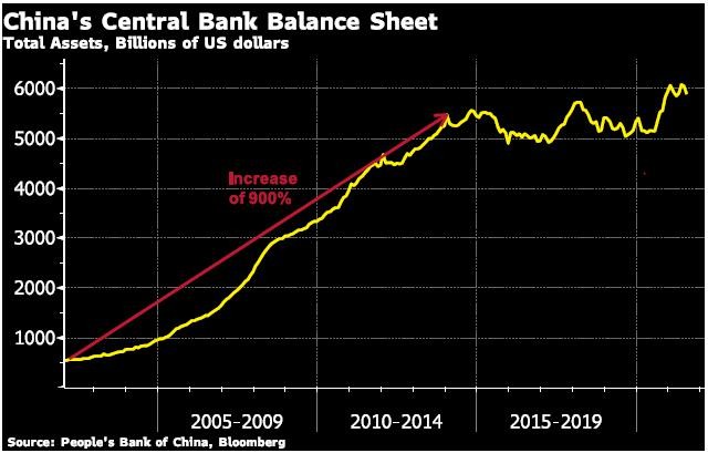 At the heart of all this growth was a ballooning central bank balance sheet. From 2000, when China joined the WTO until 2013, China’s central bank balance sheet grew almost 900%.
