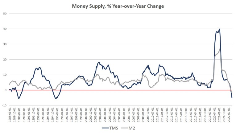 Negative money supply growth is not in itself an especially meaningful metric. But the drop into negative territory we've seen in recent months does help illustrate just how far and how rapidly money supply growth has fallen in recent months. That is generally a red flag for economic growth and employment.