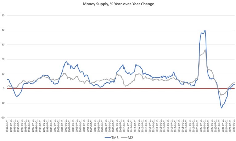 In recent months, M2 growth rates have followed a similar course to TMS growth rates, although M2 is growing faster than TMS. In February, the M2 growth rate was 3.90 percent. That’s up from January’s growth rate of 3.89 percent. February’s growth rate was also up from February 2024’s rate of negative 1.44 percent. Month over month, however, M2 decreased by -0.12 percent from January to February. That’s the largest month-to-month decline in ten months. Nonetheless, the overall trend for both TMS and M2 continues upward.