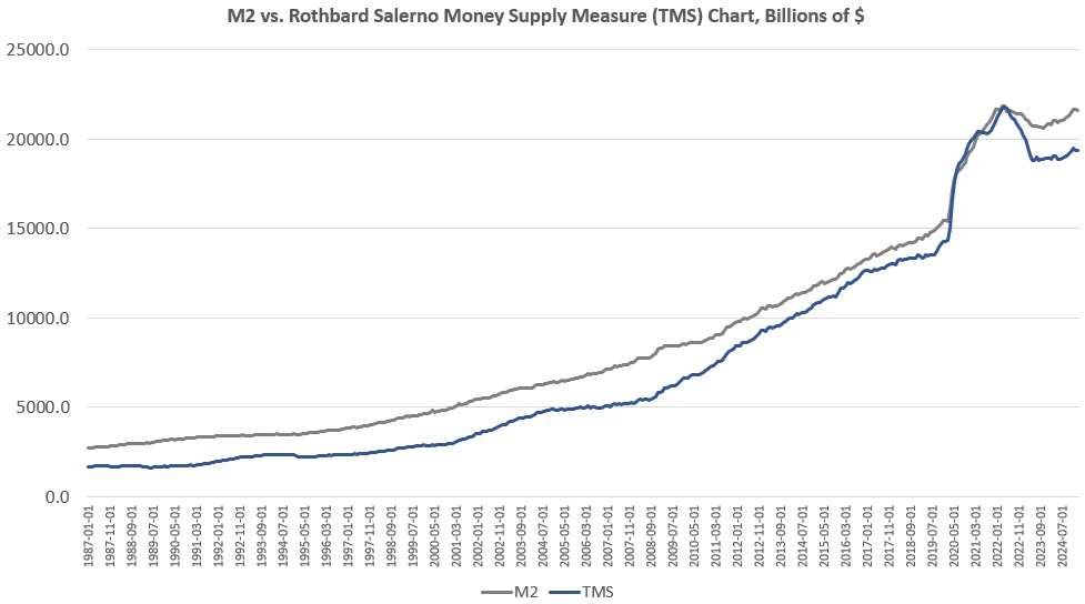 The money supply metric used here—the “true,” or Rothbard-Salerno, money supply measure (TMS)—is the metric developed by Murray Rothbard and Joseph Salerno, and is designed to provide a better measure of money supply fluctuations than M2. (The Mises Institute now offers regular updates on this metric and its growth.)