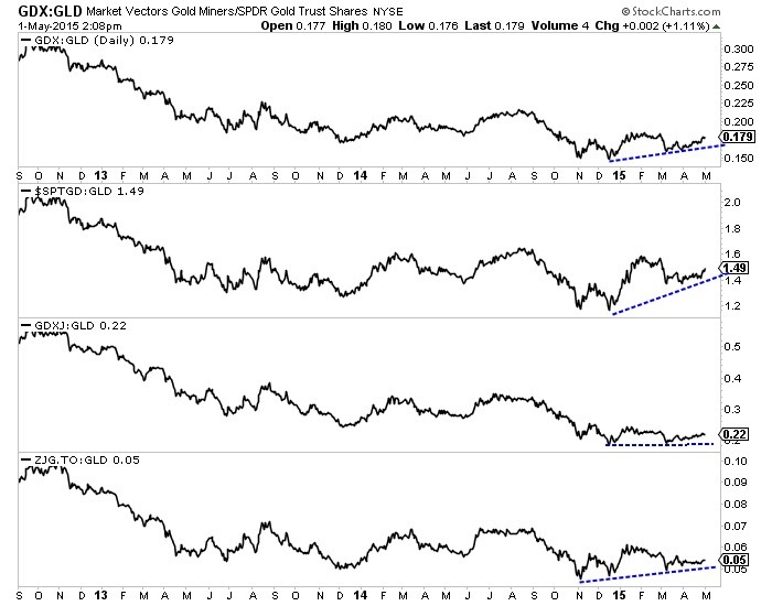 Below we plot various gold miner indices against Gold. We essentially plot the juniors and large caps from both the US and Canada against GLD. Not only have these ratios increased in recent months but they have increased in the past few weeks as Gold has declined from $1220 down below $1180. That is a very important signal of relative strength.