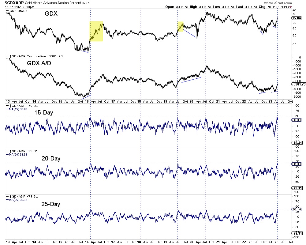 A breadth thrust occurs when a sudden burst of very strong participation follows a deep correction or bear market and very weak participation. Note the 15-day, 20-day, and 25-day readings of the GDX advance decline line.