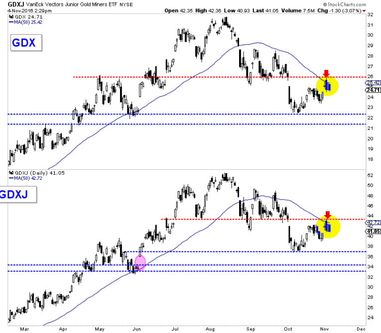 In the daily candle chart below, you can see how this week the miners failed at a confluence of resistance. Over the past four trading days the miners tested but failed at their 50-day moving averages. In addition, GDX failed at $26, which was previous support. Meanwhile, GDXJ failed at $43 which was also previous support.