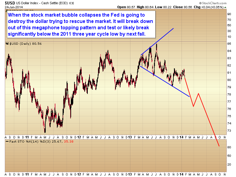 Whether the parabolic structure collapses next week or in two months we all know what the Feds response is going to be. They are going to reverse their taper decision and double or triple down on QE. The problem is that when a parabolic structure collapses it can't be put back together. My theory all along has been that when the stock market bubble pops the Fed would then completely destroy the dollar trying to pump it back up and that liquidity would then flow into the commodity markets instead of the broken parabola of the stock market and create another inflationary event similar to 2008.