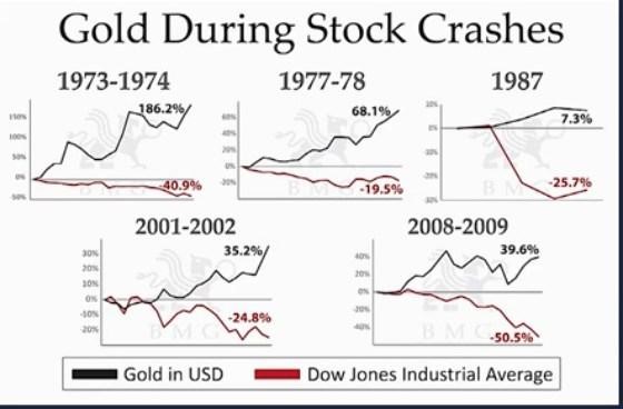 This chart courtesy BMGbullion.com shows the performance of gold during stock market crashes.
