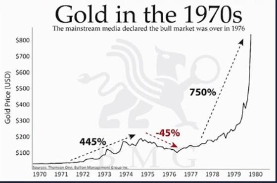 This chart is also courtesy BMGbullion.com and it shows the percentage rise in the price of gold after a major correction. In the event that history repeats, then a 445% increase from $1,120 sets up a target at $6,000; a 750% increase from $1,120 sets up a target at $9,500. The average rise would take gold to $7,700. The three charts featured above are borrowed from Nick Barisheff at BMGbullion.com. At his website one can access a 12 minute video featuring these charts and a few more.