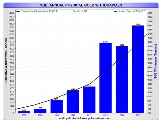 This chart is also courtesy Goldchartsrus.com and shows the number of tonnes of gold withdrawn by jewelers and investors during 2015 at the SGE, which was the highest ever - almost 2600 tonnes.
