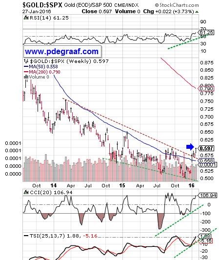 This weekly chart compares gold to the S&P 500 index. Price is breaking out in favor of gold, from a bullish falling wedge. A Friday closing price above the blue arrow will confirm the breakout. This is bullish for gold as it shows investors bailing out of the stock market (the current ‘dead cat bounce notwithstanding), and seeking safety in gold. The supporting indicators are positive (green lines rising upward).
