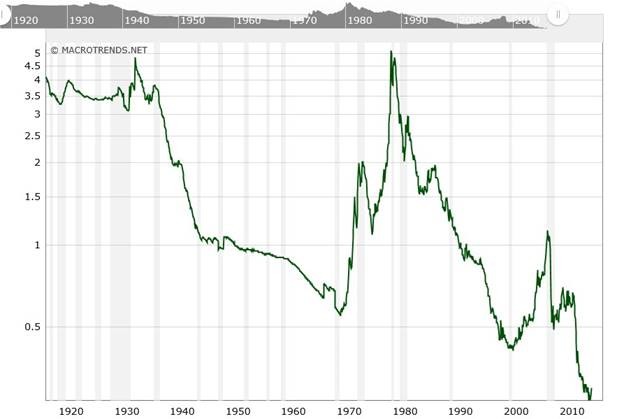 This chart courtesy www.macrotrends.net shows the price of gold compared to the US Monetary Base. The current ratio is at 0.30 and this is the lowest it has ever been! This makes gold the least expensive (compared to the monetary base), in history!